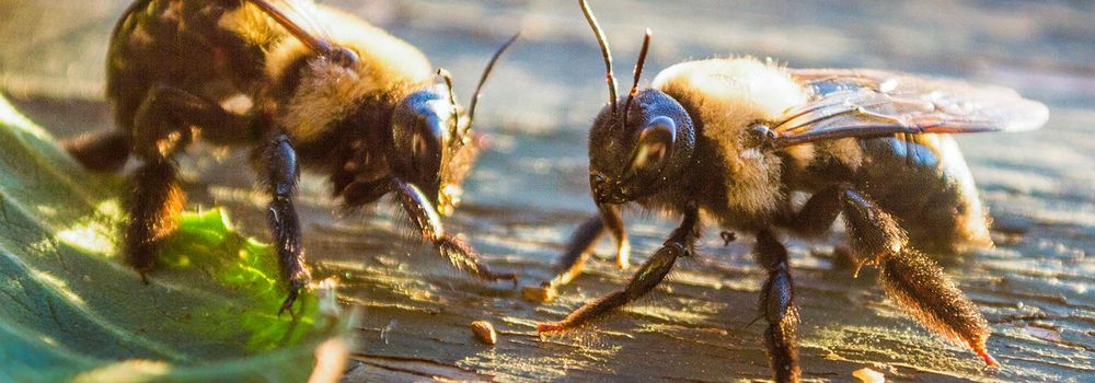 Male carpenter bees do not sting but are known for their aggressive and menacing behavior when trying to protect their space.